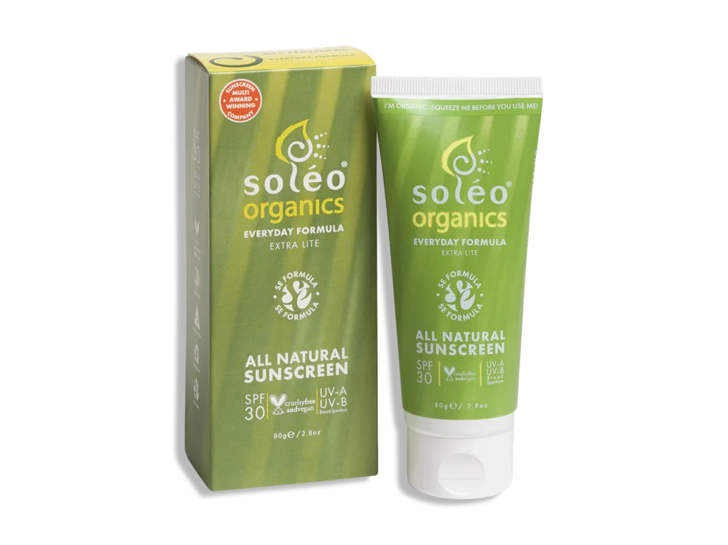 I always recommend natural, physical sunscreens, as chemical sunscreens can contain a broad range of toxins that not only upset your skin’s microbiome but can also be harmful to our oceans. Sun protection should be worn daily, even when you spend most of your time indoors. In this case, choose a light moisturiser with SPF, such as Clemence Organics Protect + Clarify Daily Face Lotion. If you’re heading to the beach or spending the day outdoors, opt for a natural zinc-based sunscreen that won’t disrupt your skin’s microbiome. I love the Soleo Organic Sunscreen, as well as the Edible Beauty Basking Beauty Natural Sunscreen.