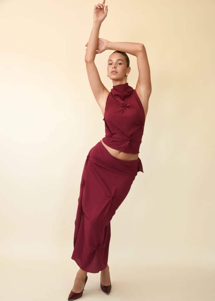 If Christmas Day had a signature colour, this would be it. Koster Kulture’s Marbella set in rich wine red is the definition of that festive opulence, the kind of outfit that has you sipping champagne from a crystal coupe and blaming your glow on the Christmas lights… not the wine. The halter top gives that modern, sculpted silhouette, while the matching skirt adds fluidity and drama. It’s the perfect choice for a formal family dinner or an elevated Christmas lunch where dressing up isn’t optional, it’s tradition. Think high-shine glam with zero compromise on comfort, ideal for drifting from the table to the couch and back again.