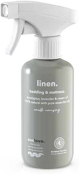 Infused with calming essential oils like Australian eucalyptus, French and Bulgarian lavender, and Indian Vetiver, this linen spray helps create a serene atmosphere for restful sleep.