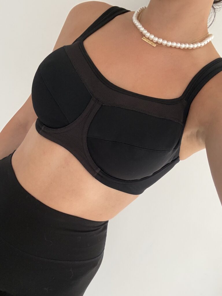 When I first tried on the High Impact Sports Bra, I was surprised in the best way. It just fit. My bust was fully covered, with zero spillage or side-boob action, and the band felt secure without digging in.