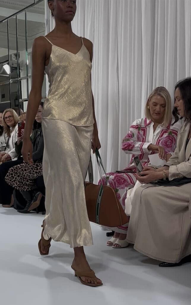 Frock Me Out injected a wave of nostalgia through coordinated sets, prints, and silhouettes that slightly nodded to the ’70s. Free-spirited femininity met with a modern edge with a reminder that chic still belongs on the runway. Kinney captivated with fluid silhouettes and sunlit tones, the Rou Cami and Gia Skirt in Gold Lustre stood out, striking the perfect balance between ease and elegance.