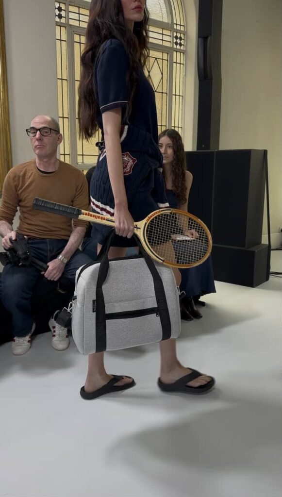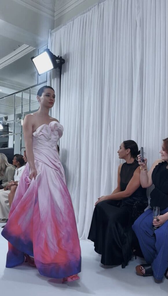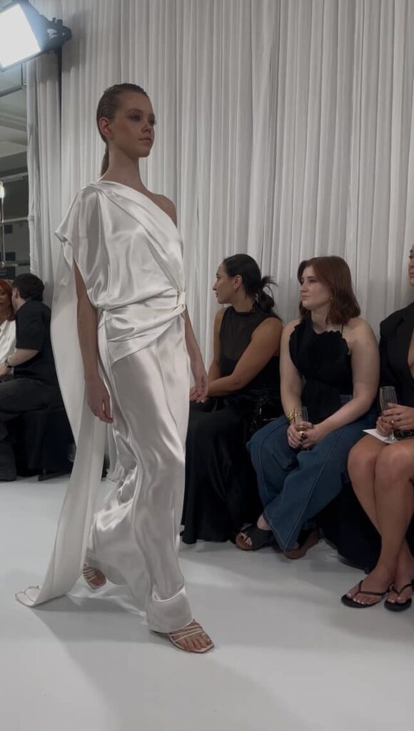 Both brands were often styled with Byrd Studios’ handcrafted vegan leather bags, each piece designed with intention that were nothing short of stunning. Serafina shifted the mood with dusty olives, deep denim, and that unmistakable European summer energy. Iris & Wool then brought the softest kind of power, working 100% certified Australian merino into knits that felt as tactile as they looked. It was nature meeting fashion, their knit dresses being a standout. An effortless preview of next winter’s understated luxury. Closing the emerging lineup, Catherine Ferraro delivered gowns that reminded the audience why craftsmanship still matters.
