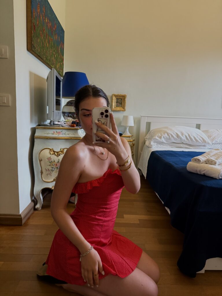 No outfit captured The White Lotus mood better than my Love By Venus “Bridget Dress”. Polka dots are so fab right now, and the strapless, cherry-red number felt made for gelato runs and Aperol hours (forgive the repeated Aperol mentions, it really was that serious). The romantic texture balanced old-Hollywood femininity with that modern, slow-fashion ethos. Love by Venus designs everything locally and in small batches, which somehow makes slipping into their dresses feel more intentional; each piece carries its own summer story.
